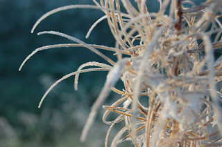 Ängen bakom växthuset var vit av rimfrost tidigt på morgonen, tur att mina exoter har ett växthus att söka skydd i.